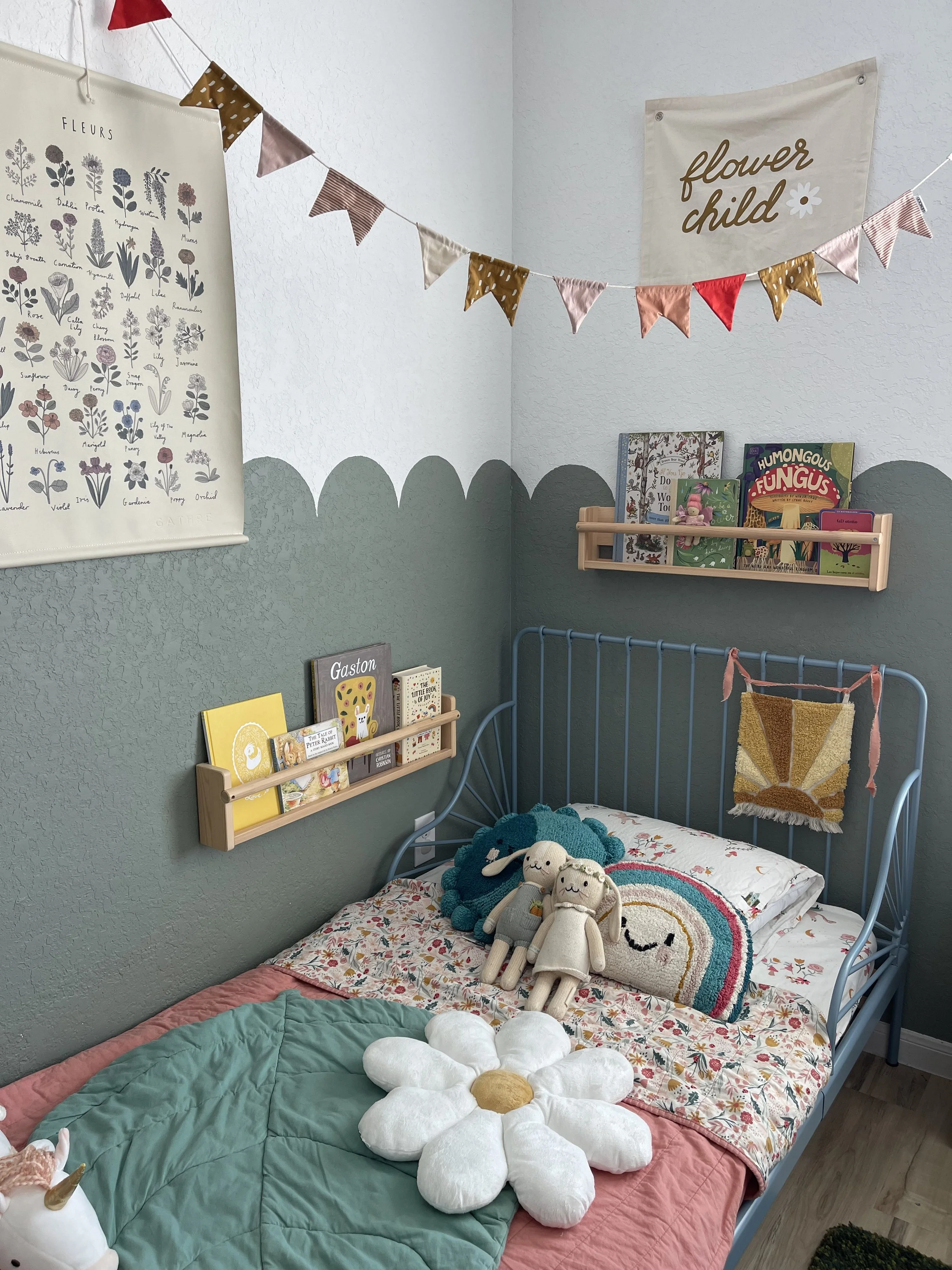 We have two child-friendly wall shelves which my oldest daughter uses to pick out books by her bed.