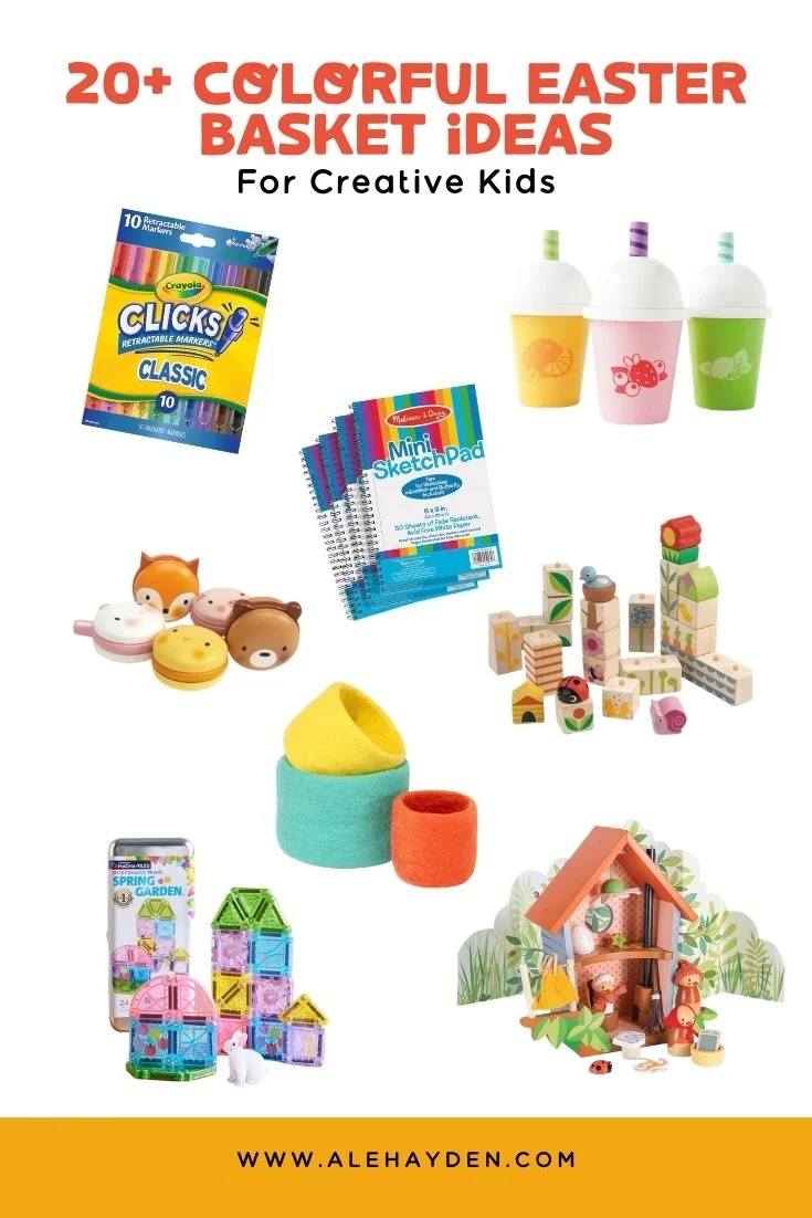 In this guide, I’m sharing my favorite colorful Easter basket ideas that encourage imagination, art, and hands-on play. These are the exact items I’d put in a basket for creative kids, ages 2-6, who love to draw, build, and explore. I have also curated them with a subtle Garden-theme in mind!