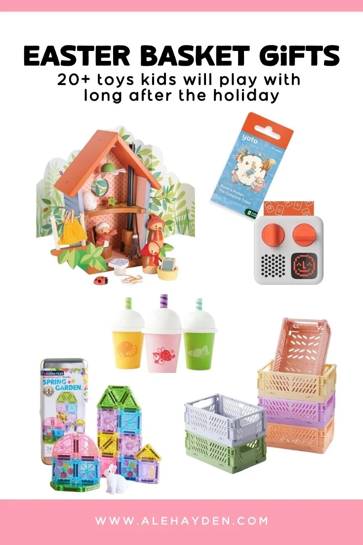 Imaginative play toys. Some of the ones I have added to my Easter baskets over the years have included: wooden figurines, garden play sets, little cars, and dollhouse accessories. My children love pretend play and these are a hit every time. They love these because they inspire unique stories, they role-play in a very visual and hands-on way, and are a great opportunity to act out the world around them.