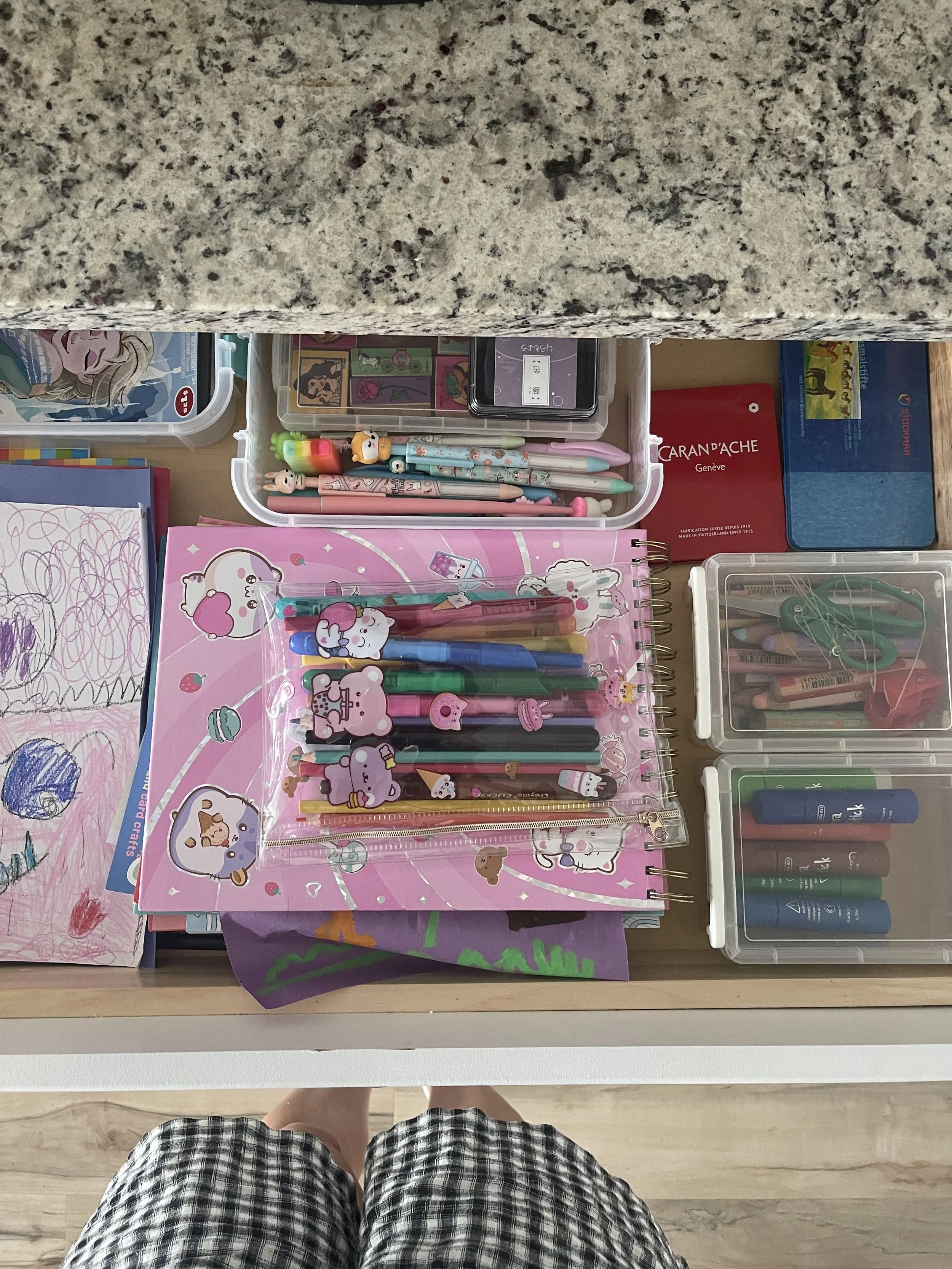 A drawer with supplies for my 6-year-old. She has stickers, a sketchbook, tempera paints, pens, stamps, stamp pad, markers, crayons, chunky colored pencils, and child-safe scissors as pictured below.