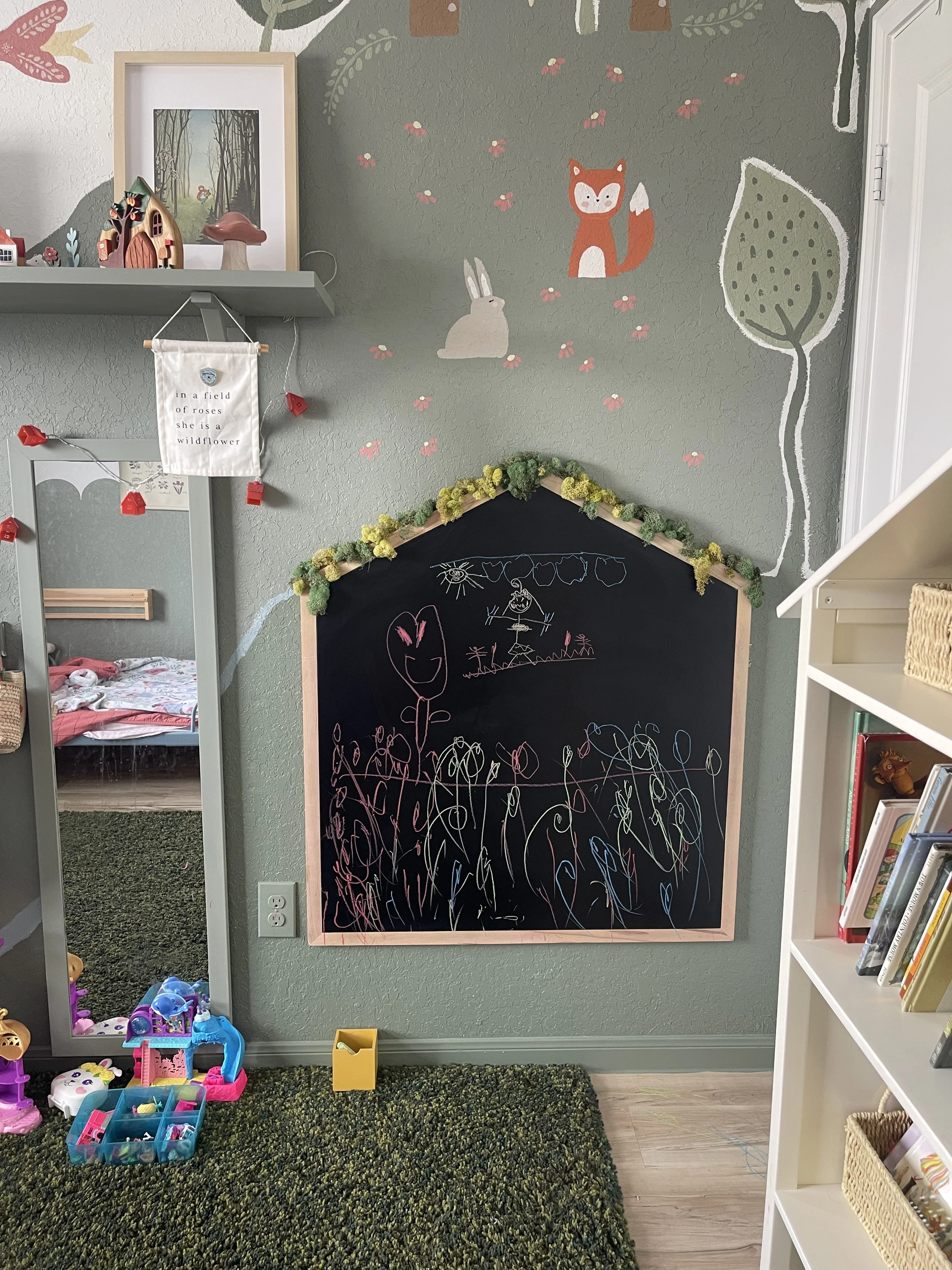 Some inspiration! We have added a chalkboard to my 6-year-old’s room where she can display her art and practice her art during her independent quiet time.